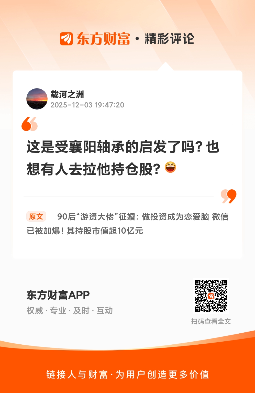 我在《90后“游资大佬”征婚:做投资成为恋爱脑 微信已被加爆!其持股市值超10亿元》的评论获得了大家的关注。