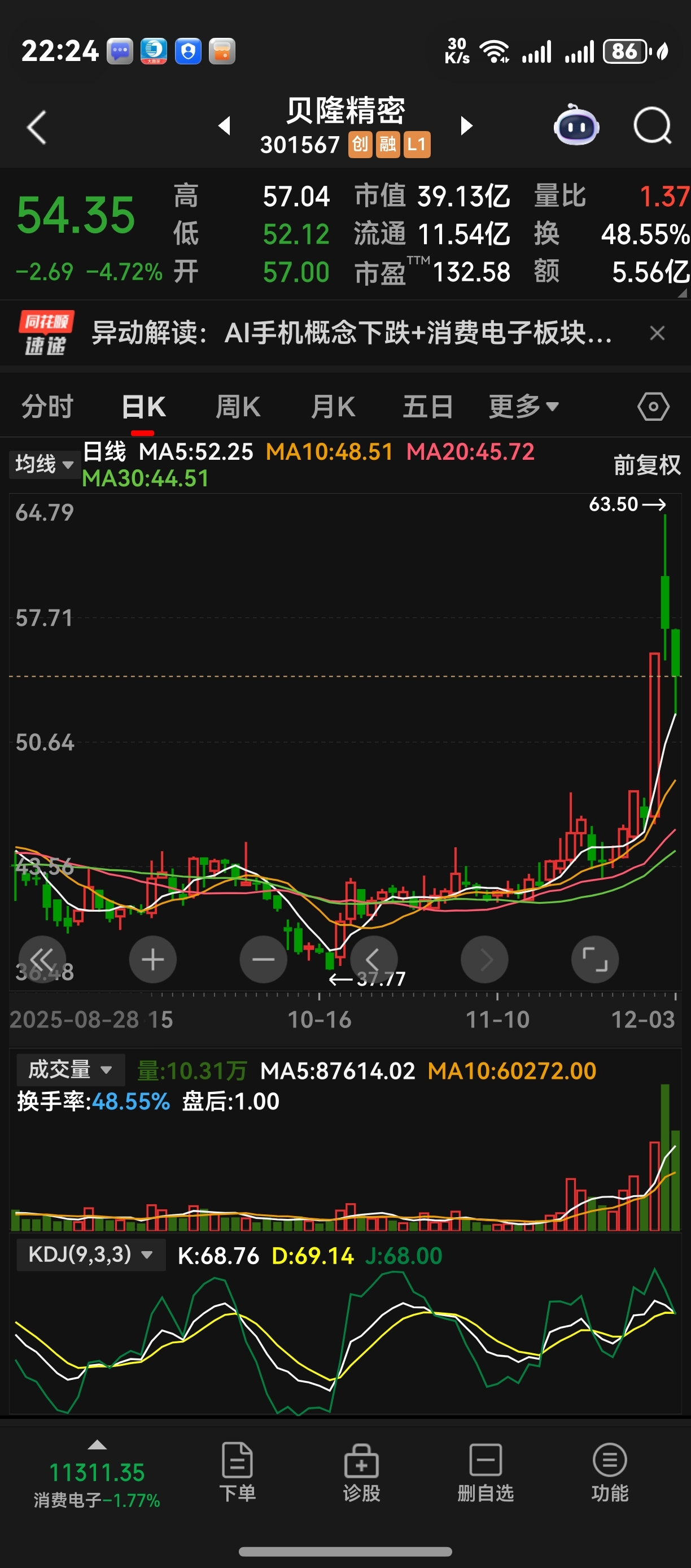 贝隆精密(301567)12份总体下跌,而且涨跌不一不好把控,所以不能买入。