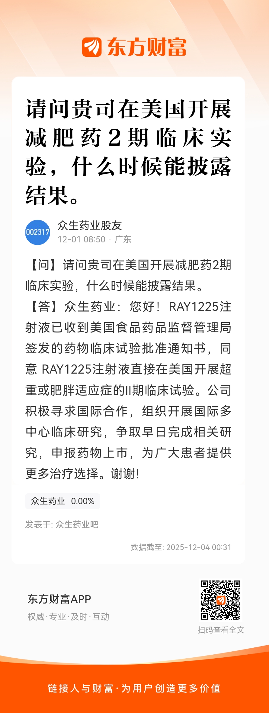 请问贵司在美国开展减肥药2期临床实验,什么时候能披露结果。
