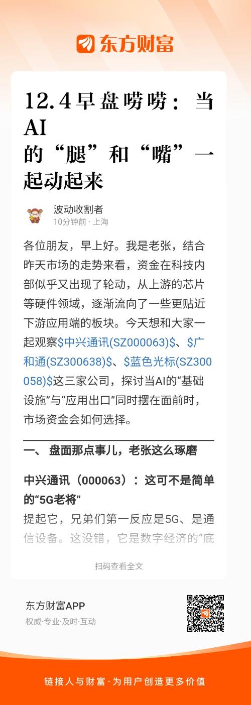 各位朋友,早上好。我是老张,结合昨天市场的走势来看,资金在科技内部似乎又出现了轮动,从上游的芯片等硬件领域,逐渐流向了一些更贴近下游应用端的板块。今天想和大家一起观察$中兴通讯(SZ000063)$、$广和通(SZ300638)$、$蓝色光标(SZ300058)$这三家公司,探讨当AI的“基础设施”与“应用出口”同时摆在面前时,市场资金会如何选择。