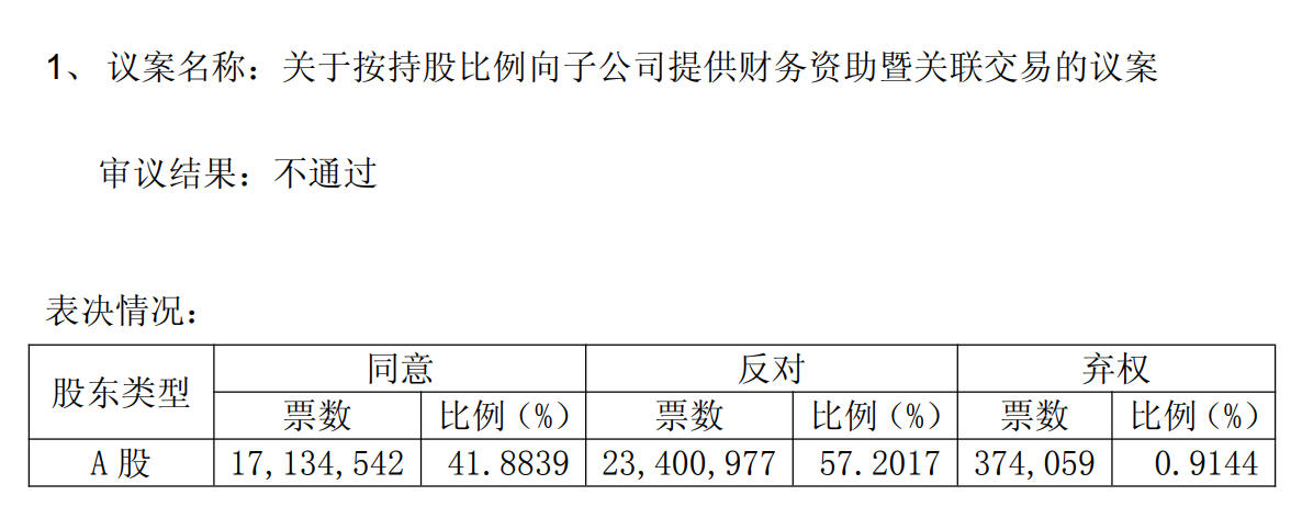 12月3日晚间,光明肉业发布公告,在当日举行的公司2025年第三次临时股东会上,《关于按持股比例向子公司提供财务资助暨关联交易的议案》被否决,该议案同意票数占比仅为41.88%,反对票占比为57.2%,另有0.91%的弃权票。