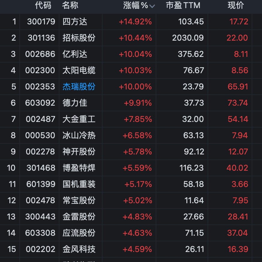 1. 四方达,暴涨15%,有深海勘探开采与智能装备$四方达(SZ300179)$