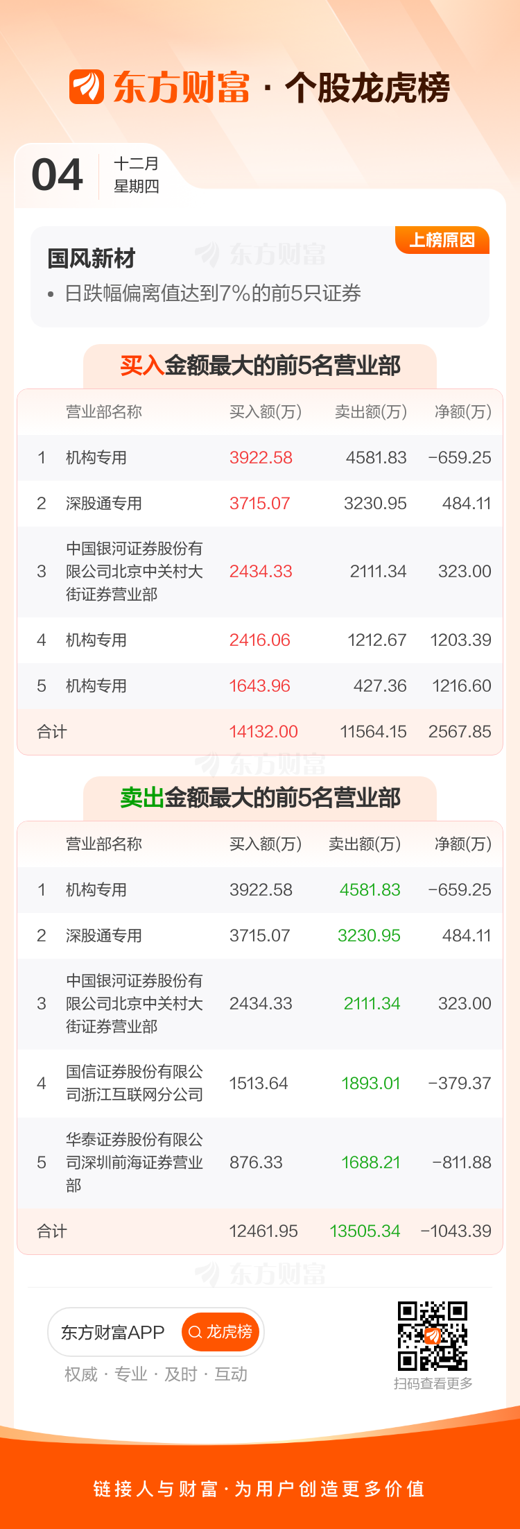 交易所2025年12月4日公布的交易公开信息显示,国风新材因成为日跌幅偏离值达到7%的前5只证券上榜。国风新材当日收报8.3元,涨跌幅-9.98%,偏离值-9.90%,换手率21.43%,成交额16.57亿。