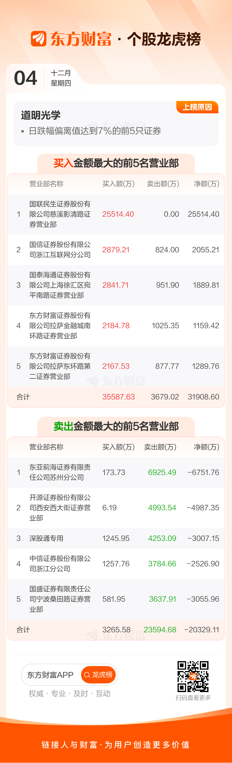 交易所2025年12月4日公布的交易公开信息显示,道明光学因成为日跌幅偏离值达到7%的前5只证券上榜。道明光学当日收报14.9元,涨跌幅-10.02%,偏离值-9.90%,换手率24.36%,成交额21.38亿。