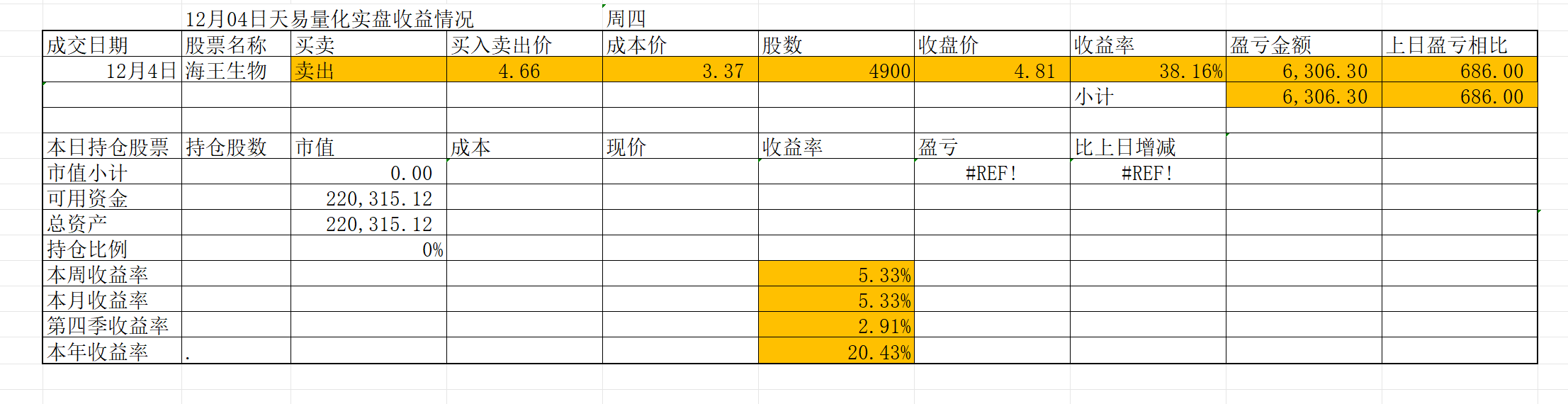 【12月4日天易量化复盘】开盘就是直线下跌海王生物一字涨停高开,但是开盘直线下杀