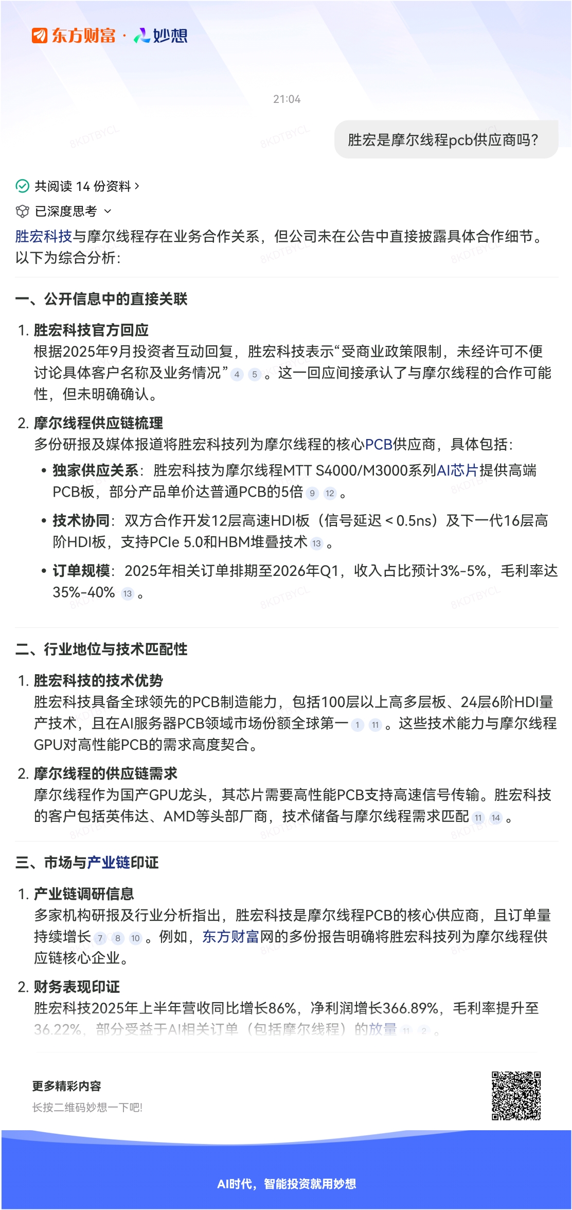 #@妙想,你怎么看?# 妙想一下:胜宏是摩尔线程pcb供应商吗?