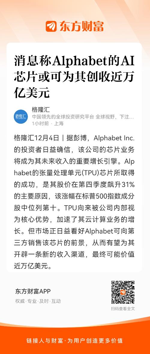 格隆汇12月4日|据彭博,Alphabet Inc.的投资者日益确信,该公司的芯片业务将成为其未来收入的重要增长引擎。Alphabet的张量处理单元(TPU)芯片所取得的成功,是其股价在第四季度飙升31%的主要原因,该涨幅在标普500指数成分股中位列第十。TPU向来被公司内部视为核心优势,加速了其云计算业务的增长。但市场正日益看好Alphabet可向第三方销售该芯片的前景,从而有望为其开辟一条新的收入渠道,最终可能价值近万亿美元。