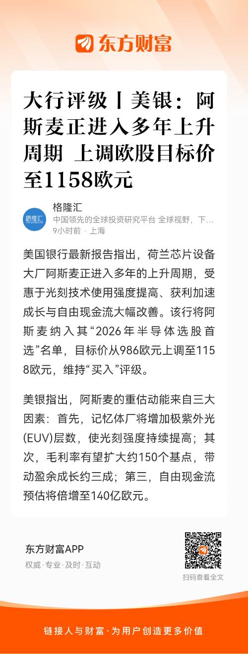 美国银行最新报告指出,荷兰芯片设备大厂阿斯麦正进入多年的上升周期,受惠于光刻技术使用强度提高、获利加速成长与自由现金流大幅改善。该行将阿斯麦纳入其“2026年半导体选股首选”名单,目标价从986欧元上调至1158欧元,维持“买入”评级。