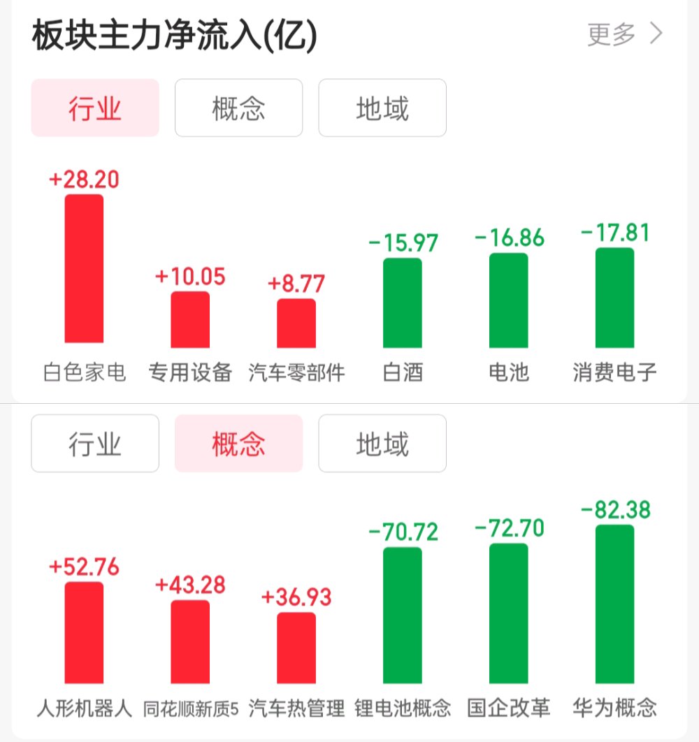 板块:昨日电机、减速器、国家大基金、新质50、航空发动机、成飞概念等几个板块表现得相对活跃,涨幅排名靠前。昨日资金大量流入人形机器人、新质50、汽车热管理、白色家电、专用设备等板块,资金从华为概念、国企改革、锂电池、消费电子板块大量流出。昨日板块表现都不理想,仅机器人表现活跃一些。这主要是老美将allin机器人,怕我国也会加大机器人研制和扶持,这板块可多留意。目前板块轮动依旧很快、持续差,也应适可而止、落袋为安。