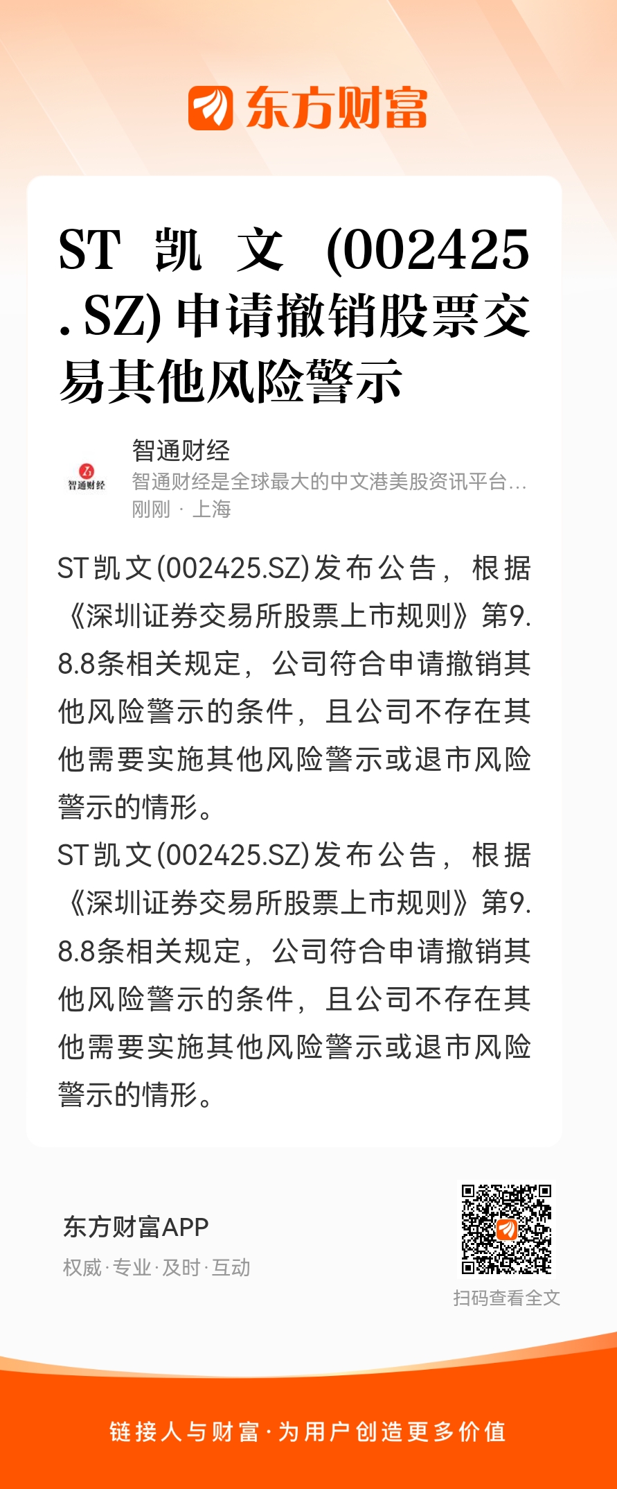 ST凯文(002425.SZ)发布公告,根据《深圳证券交易所股票上市规则》第9.8.8条相关规定,公司符合申请撤销其他风险警示的条件,且公司不存在其他需要实施其他风险警示或退市风险警示的情形。