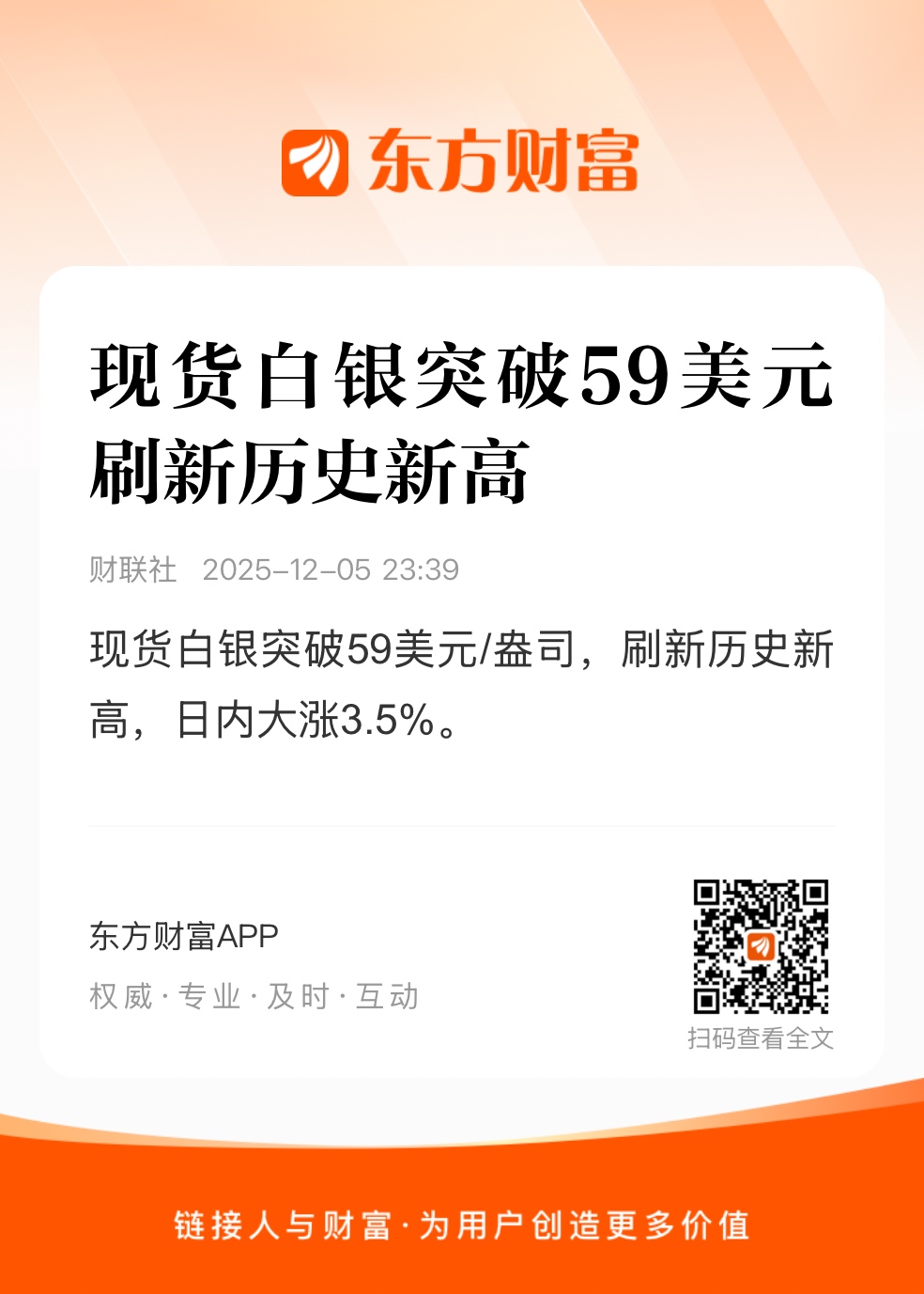 现货白银突破59美元/盎司,刷新历史新高,日内大涨3.5%。