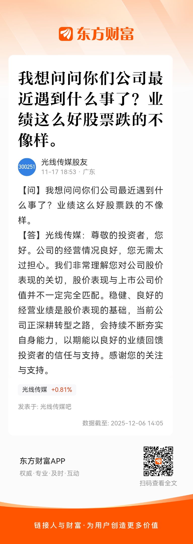 我想问问你们公司最近遇到什么事了?业绩这么好股票跌的不像样。