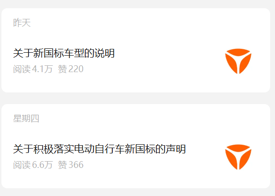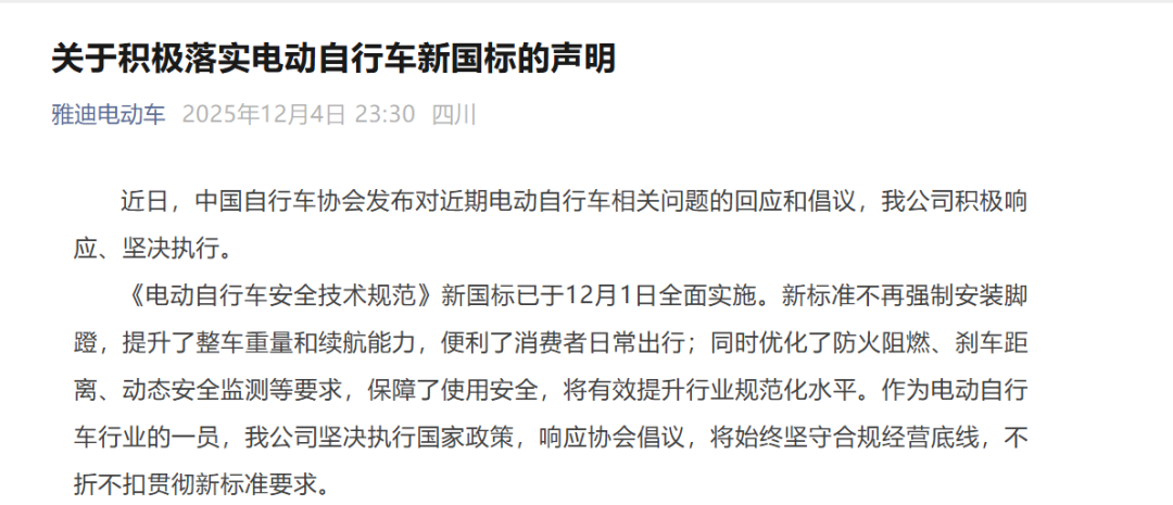 12月4日晚上23:30分,雅迪先是发布关于《积极落实电动自行车新国标的声明》。