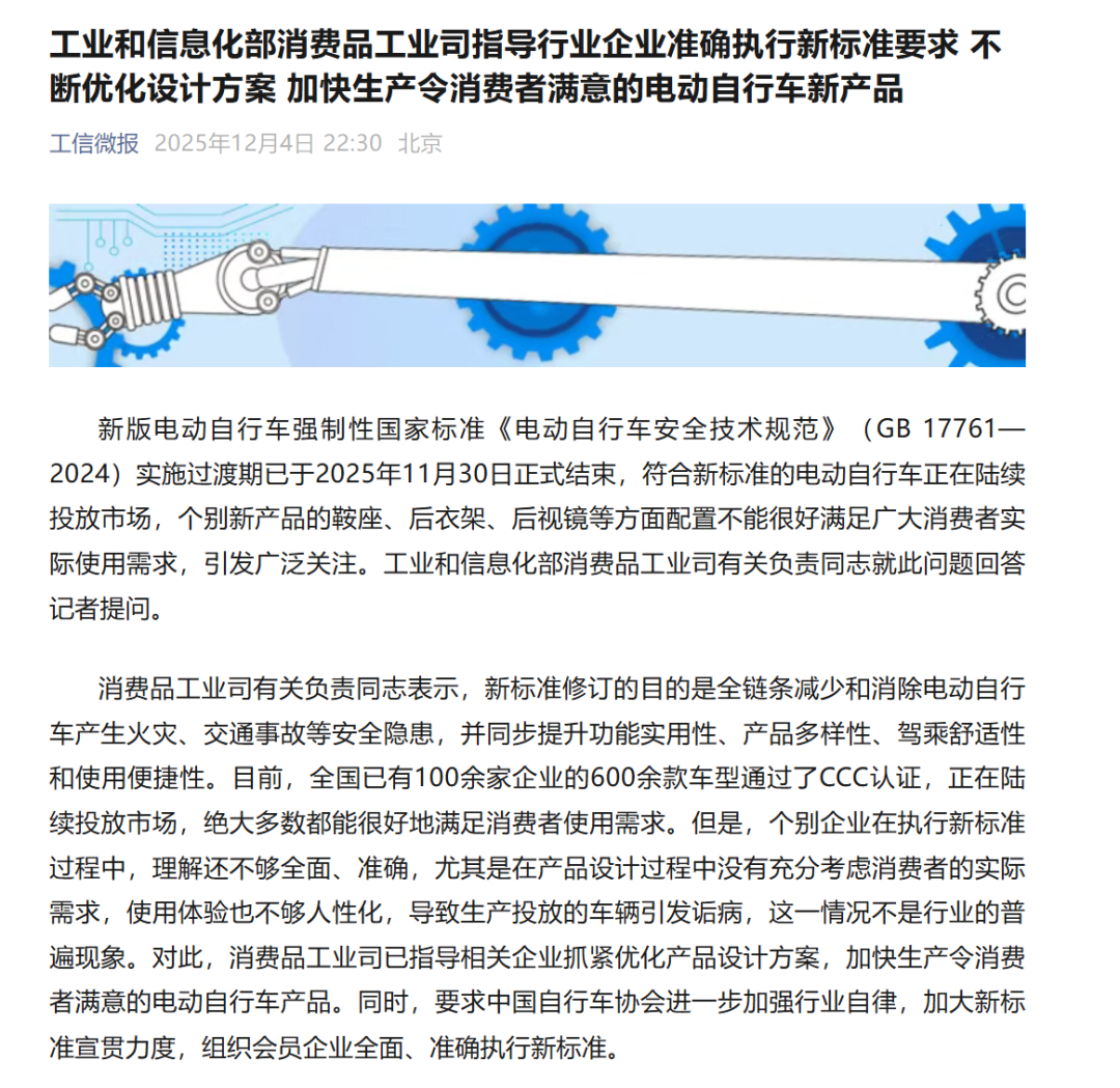 同时,工信部消费品工业司也发文指出,新标准修订的目的是全链条减少和消除电动自行车产生火灾、交通事故等安全隐患,并同步提升功能实用性、产品多样性、驾乘舒适性和使用便捷性。目前,全国已有100余家企业的600余款车型通过了CCC认证,正在陆续投放市场,绝大多数都能很好地满足消费者使用需求。