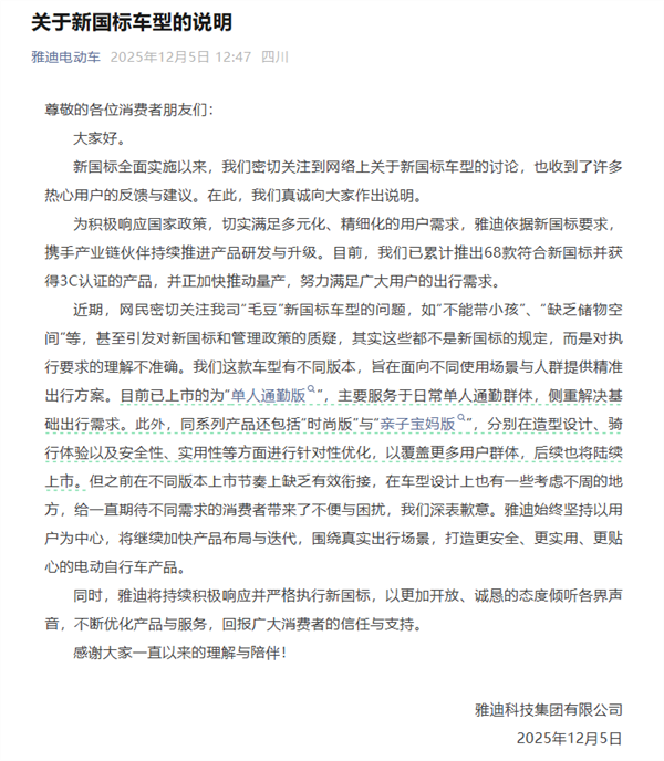 但这个声明,消费者显然不买账。12月5日,雅迪又发布了《关于新国标车型的说明》。