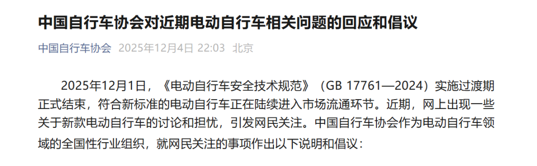 12月4日,中国自行车协会发文表示:近期网络上出现的讨论和热议,反映出广大消费者对新标准产品的关注和期待,但个别企业对新标准产品的生产准备不充分、宣传解释不到位,造成有些网民的误读误解。