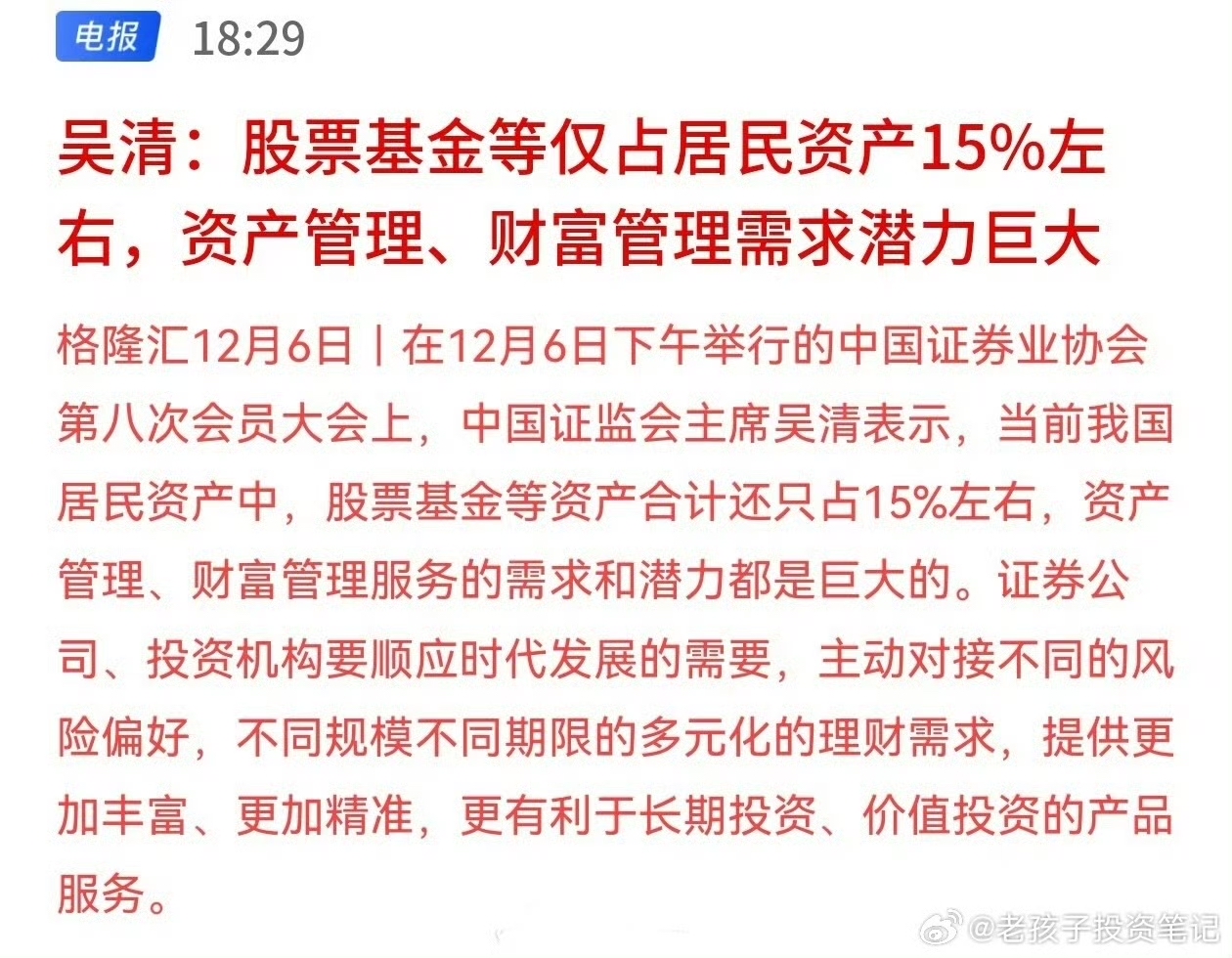 吴清:股票基金等仅占居民资产15%左右,资产管理、财富管理需求潜力巨大…