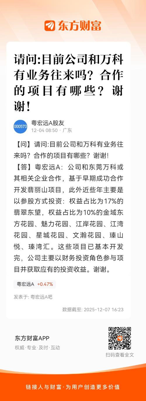公司和东莞万科或其相关企业合作,基于早期成功合作开发翡丽山项目,此外近些年主要是以参股方式投资:权益占比为17%的翡翠东望,权益占比为10%的金域东方花园、魅力花园、江岸花园、江湾花园、星城花园、文瀚花园、瑧山悦、瑧湾汇。这些项目已基本开发完,公司主要以财务投资角色参与项目并获取应有的投资收益。谢谢。
