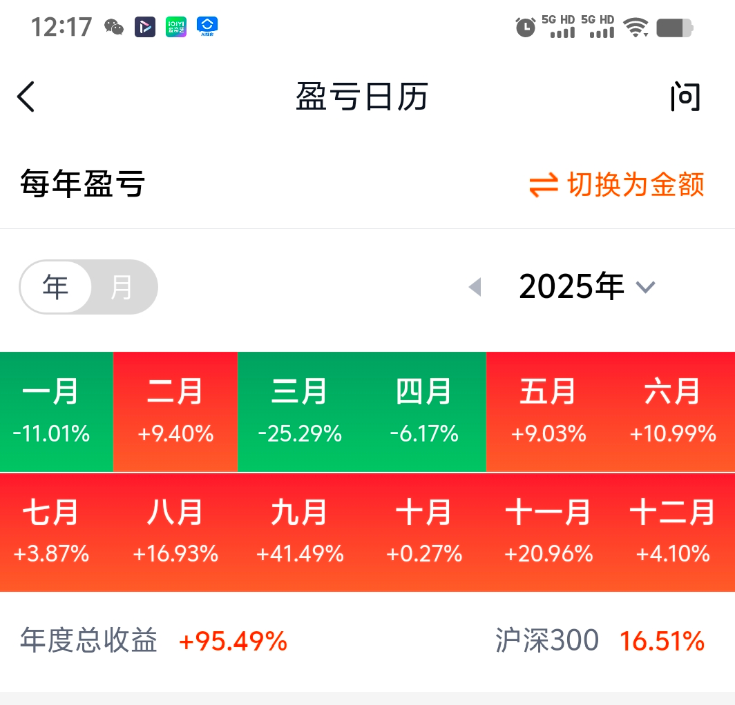 短线交易,年初表现很差,运气好9月中了新签,错失了很多龙头股,9块多入手的华胜挣了一个板就卖掉了,做短线的好处是及时止损,落袋为安,希望自己能走出自己的风格,不断在失败中总结经验,不要后悔自己的决定,加油,明年目标冲击20W