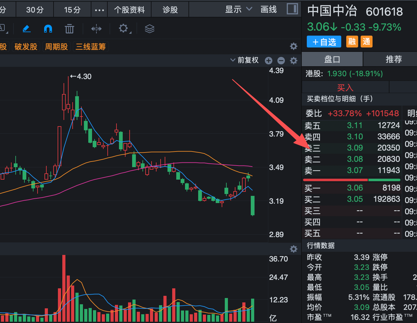 这个股票就是中国中冶,今天早盘开盘直接低开了5%左右,开盘之后就一路抛盘直接逼近跌停,现在就差一分钱就跌停了,所以可以说是准跌停了。$中国中冶(SH601618)$$中国交建(SH601800)$