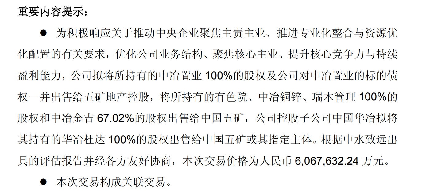 第一个:12月8日晚间公司公告,拟将中冶置业100%股权及中冶铜锌等多元业务板块,以超600亿元价格转让给中国五矿相关主体。这种处理削弱了自身有色金属属性,模糊了市场对其未来业务定位的预期。加之接盘方五矿地产近年累计亏损接近60亿港元,市场担忧资产转让后的整合效果与公司后续盈利增长点。