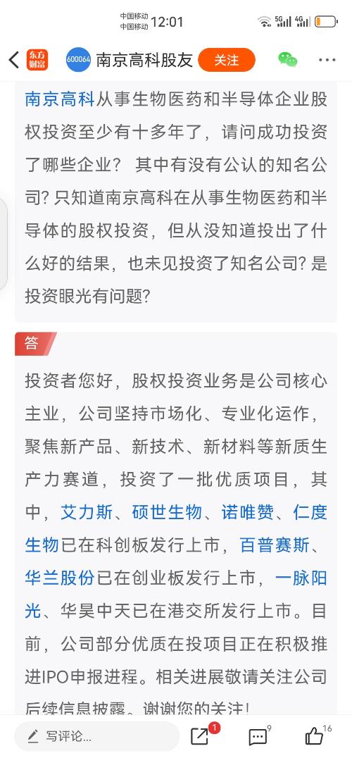 南京高科从事生物医药和半导体企业股权投资至少有十多年了,请问成功投资了哪些企业? 其中有没有公认的知名公司? 只知道南京高科在从事生物医药和半导体的股权投资,但从没知道投出了什么好的结果,也未见投资了知名公司? 是投资眼光有问题?答投资者您好,股权投资业务是公司核心主业,公司坚持市场化、专业化运作,聚焦新产品、新技术、新材料等新质生产力赛道,投资了一批优质项目,其中,艾力斯、硕世生物、诺唯赞、仁度生物已在科创板发行上市,百普赛斯、华兰股份已在创业板发行上市,一脉阳光、华昊中天已在港交所发行上市。目前,公司部分优质在投项目正在积极推进IPO申报进程。相关进展敬请关注公司后续信息披露。谢谢您的关注!