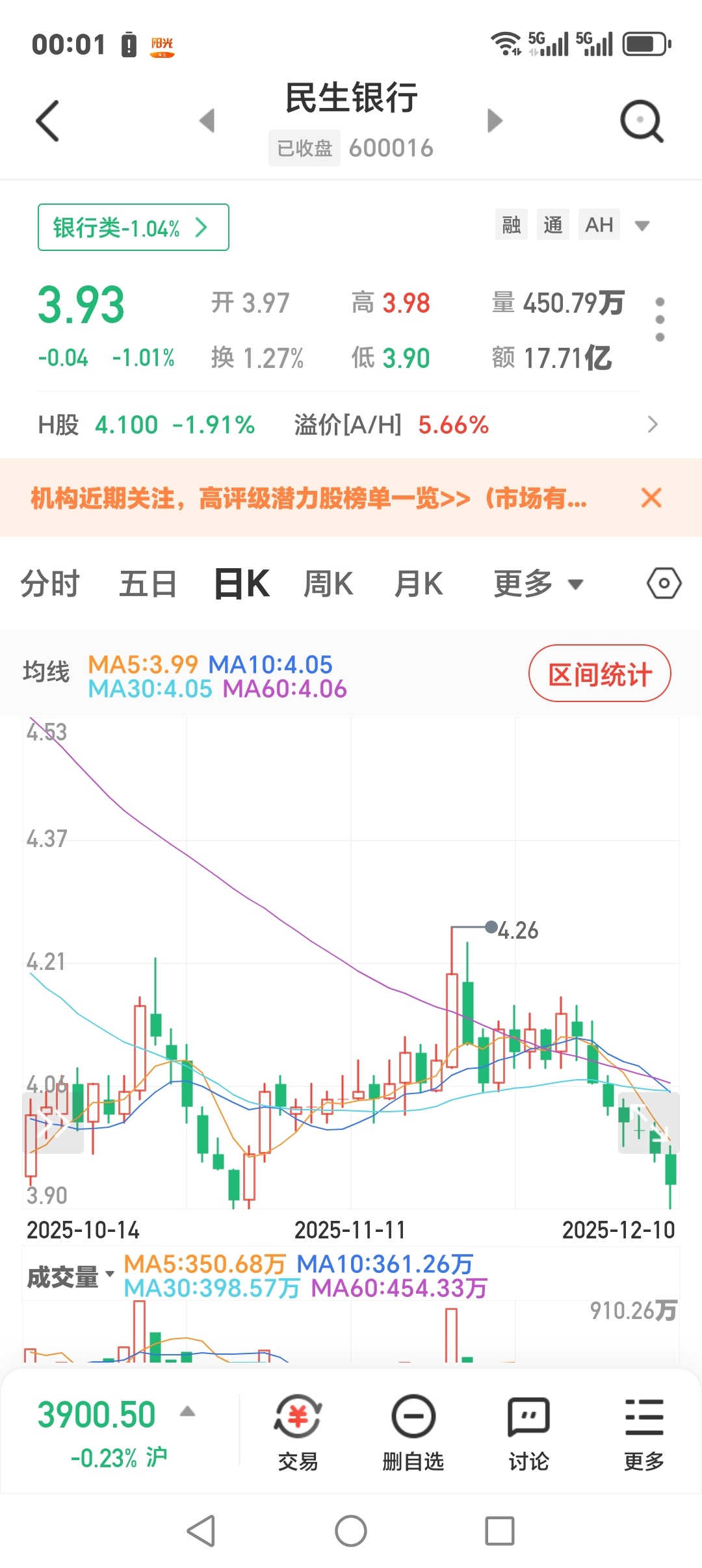 民生银行走了一个,这个情况确实有点意外,由微利变微亏,暂不加仓也不减仓。