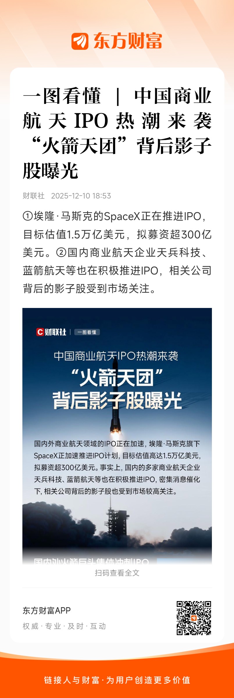 ①埃隆·马斯克的SpaceX正在推进IPO,目标估值1.5万亿美元,拟募资超300亿美元。②国内商业航天企业天兵科技、蓝箭航天等也在积极推进IPO,相关公司背后的影子股受到市场关注。
