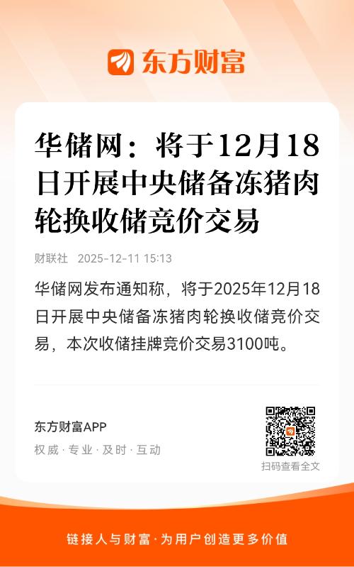 华储网发布通知称,将于2025年12月18日开展中央储备冻猪肉轮换收储竞价交易,本次收储挂牌竞价交易3100吨。