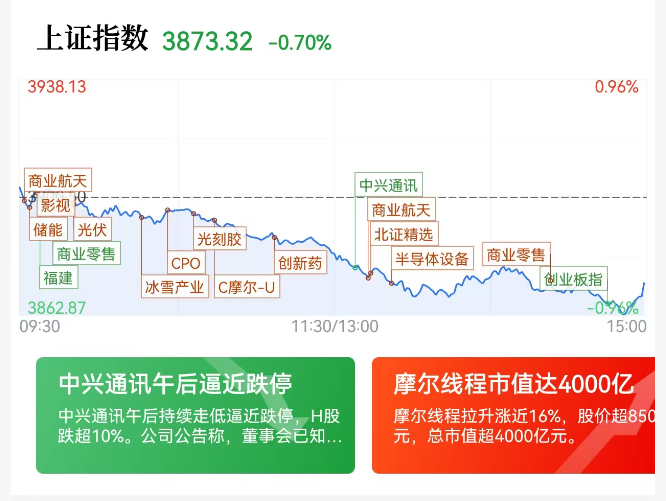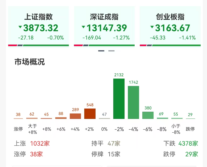 数据说话,今天是真·普跌:沪指跌0.70%报3873.32,深成指跌1.27%,创业板指跌1.41%,小票跌得更惨。两市1.89万亿成交额没缩水,但近4400只股飘绿,仅752只涨,28只跌停+28%炸板率,手里的票不绿都算赢,亏钱效应拉满了!