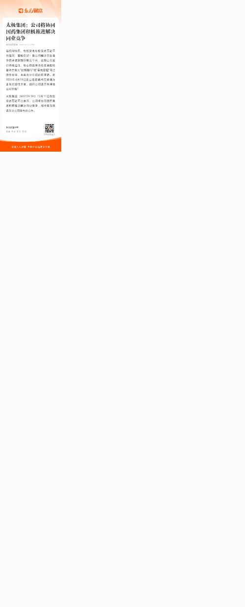 太极集团:公司将协同国药集团积极推进解决同业竞争每日经济新闻1小时前约59秒K图 600129_0每经AI快讯,有投资者在投资者互动平台提问:董秘您好!距公司解决同业竞争的承诺到期仅剩五个月,近期公司股价持续走低,核心原因系市场普遍担忧最终方案为“延期履行”或“委托管理”等过渡性安排,未能充分兑现此前承诺。若2026年4月15日前公告的最终方案确为此类过渡性方案,请问公司是否有具体应对举措?太极集团(600129.SH)12月11日在投资者互动平台表示,公司将协同国药集团积极推进解决同业竞争,相关情况敬请关注公司发布的公告。分享至:微信朋友圈微博郑重声明:东方财富发布此内容旨在传播更多信息,与本站立场无关,不构成投资建议。据此