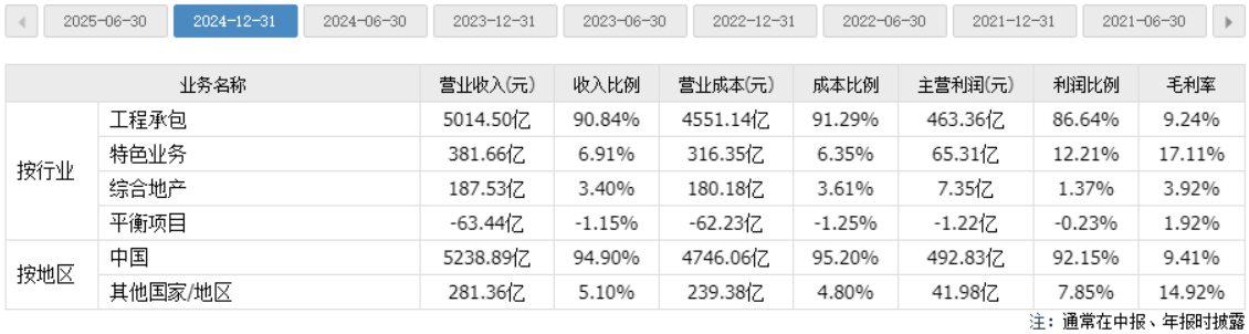 财务数据显示,2024年中冶置业扣非后净利润亏损达49亿元;2025年亏损态势进一步恶化,前7个月扣非后亏损飙升至253亿元,净资产跌至-162.8亿元,陷入严重资不抵债的境地。从中国中冶整体业务结构来看,2024年综合地产业务贡献3.4%的收入,毛利率低至3.92%,远低于公司整体盈利水平。