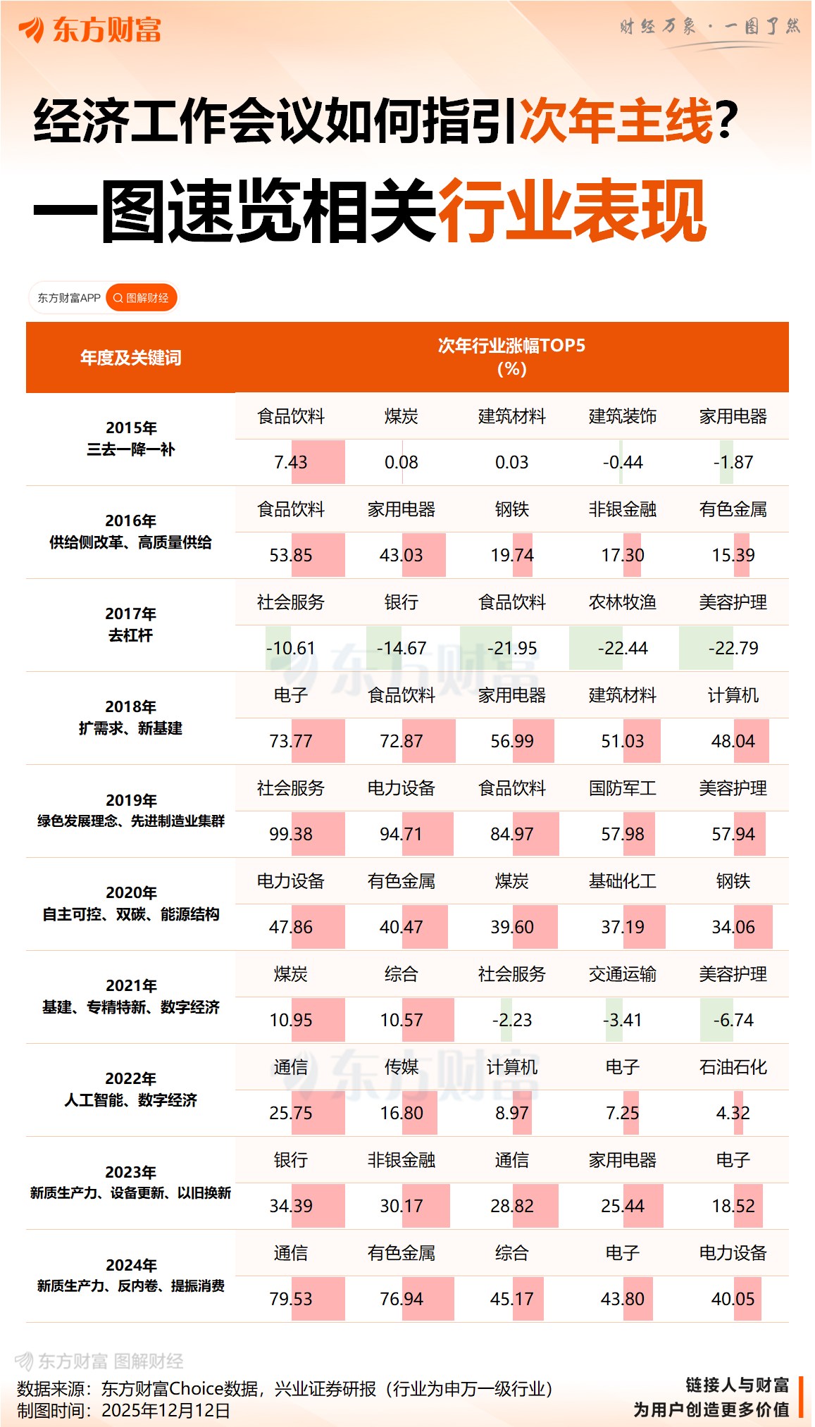 12月11日召开的中央经济工作会议总结2025年经济工作,分析当前经济形势,部署2026年经济工作。继12月8日中央政治局会议分析研究2026年经济工作,提出明年八大重点任务后,中央经济工作会议在此基础上进一步细化重点任务的政策安排和目标,并在财政货币政策、政策关键着力点等方面提出具体部署。
