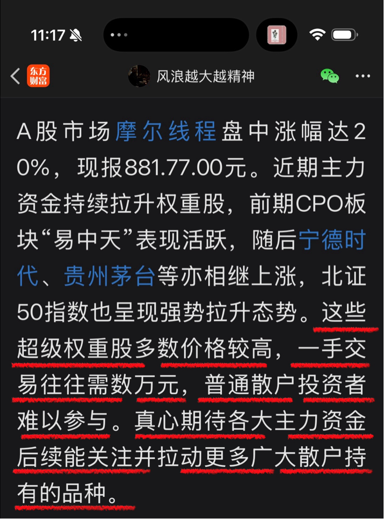 昨天曾感慨:“ 这些超级权重股多数价格较高,一手交易往往需数万元,普通散户投资者难以参与。真心期待各大主力资金后续能关注并拉动更多广大散户持有的品种。”