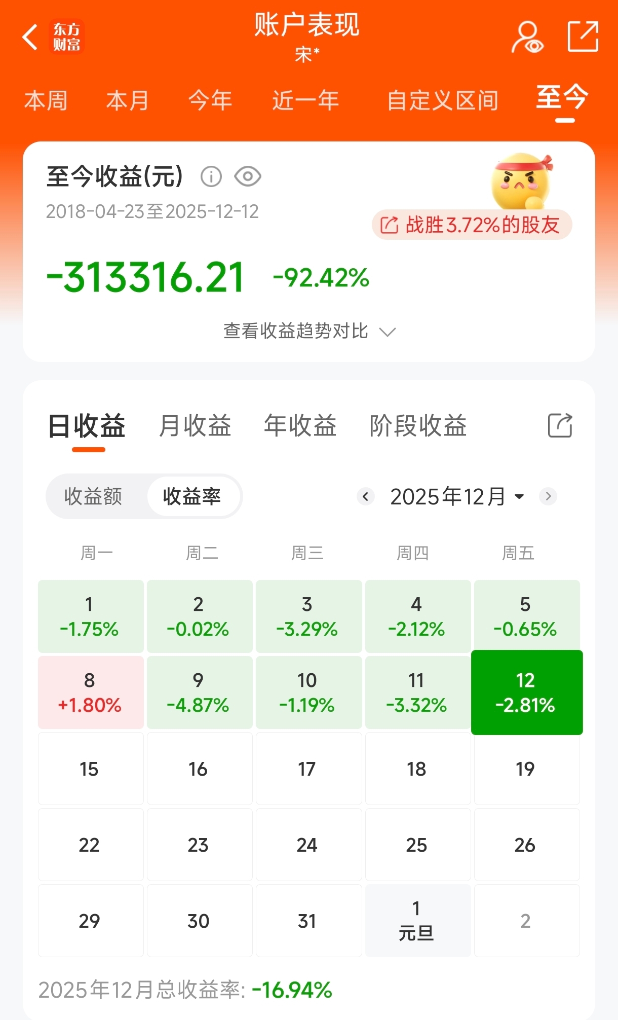 这礼拜比上礼拜好,至少红了一天。看看10个交易日9个交易日亏损。谢谢你 ,你们的时间快到了 也是我的时间到了。