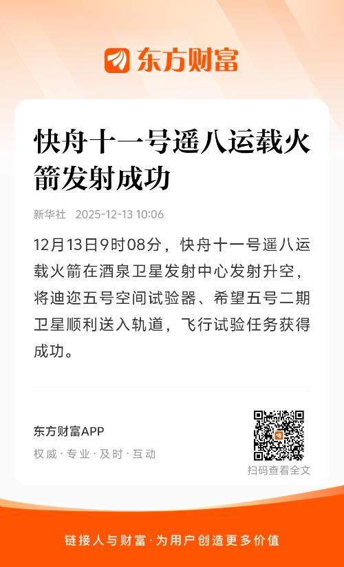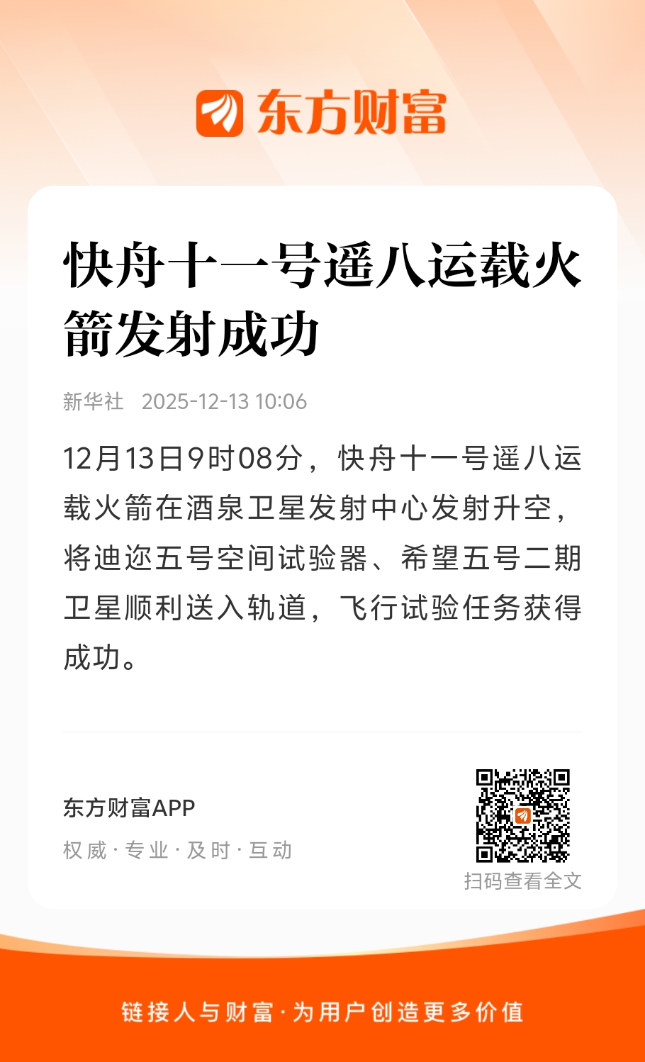 12月13日9时08分,快舟十一号遥八运载火箭在酒泉卫星发射中心发射升空,将迪迩五号空间试验器、希望五号二期卫星顺利送入轨道,飞行试验任务获得成功。