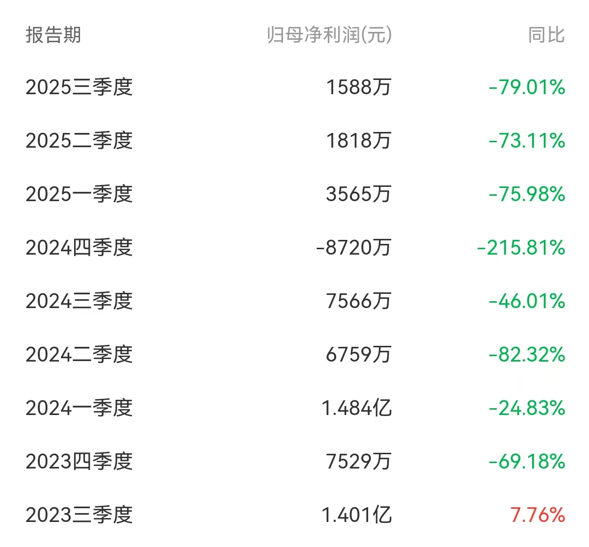 2025年三季报数据显示,虽然前三季度营收同比增长4.56%至37.23亿元,但归母净利润仍同比大幅下滑76.10%至6971万元。而从单季度来看,自2023年四季度以来,公司归母净利润已连续8个季度同比下滑。