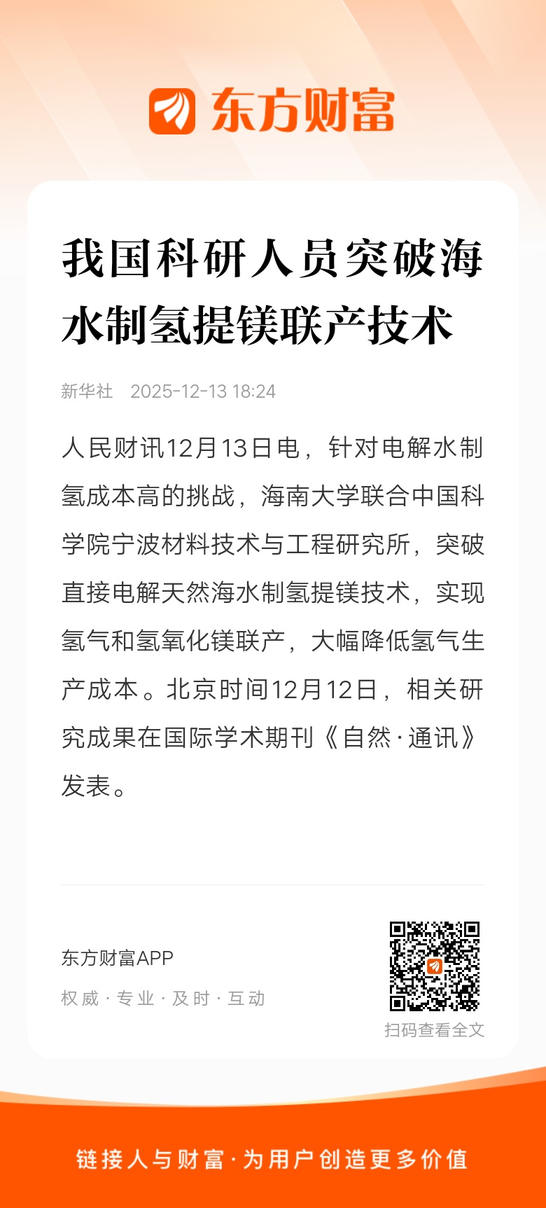人民财讯12月13日电,针对电解水制氢成本高的挑战,海南大学联合中国科学院宁波材料技术与工程研究所,突破直接电解天然海水制氢提镁技术,实现氢气和氢氧化镁联产,大幅降低氢气生产成本。北京时间12月12日,相关研究成果在国际学术期刊《自然·通讯》发表。