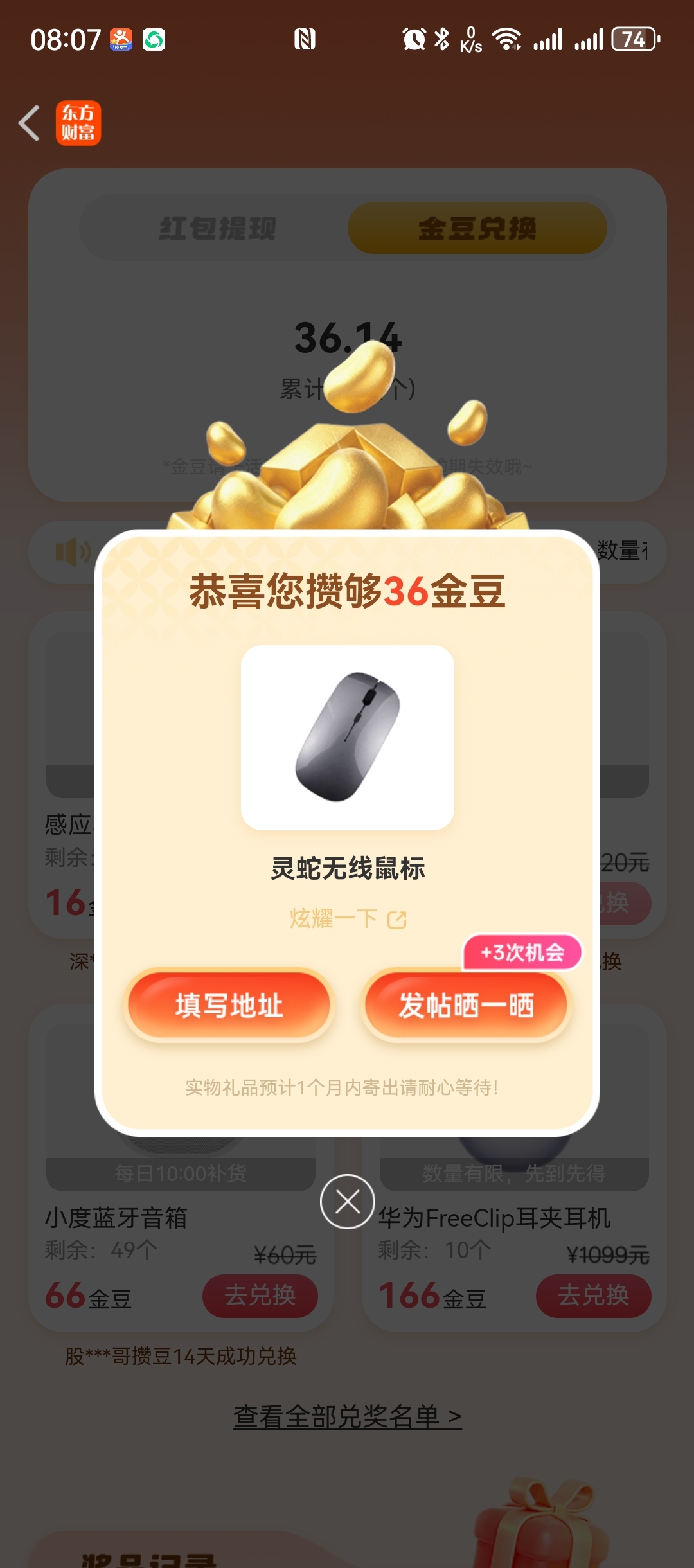 #社区牛人计划# 大家闲了没事可以多参加东财的活动,不用动脑子,就花点时间随便点点就有一些小礼品,虽然也不值啥钱,不过白给干嘛不要,哈哈!