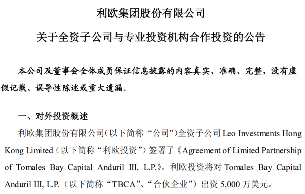 11月16日,利欧股份公告,公司全资子公司利欧投资签署了《Agreement of Limited Partnershipof Tomales Bay Capital Anduril III, L.P。》。利欧投资将对Tomales Bay CapitalAnduril III, L.P。(简称“TBCA”、“合伙企业”)出资5000万美元。