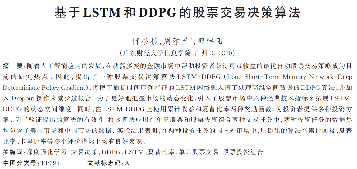 广东财经大学信息学院提出基于深度强化学习的股票交易决策算法LSTM-DDPG,在多项实验中获得出色表现。