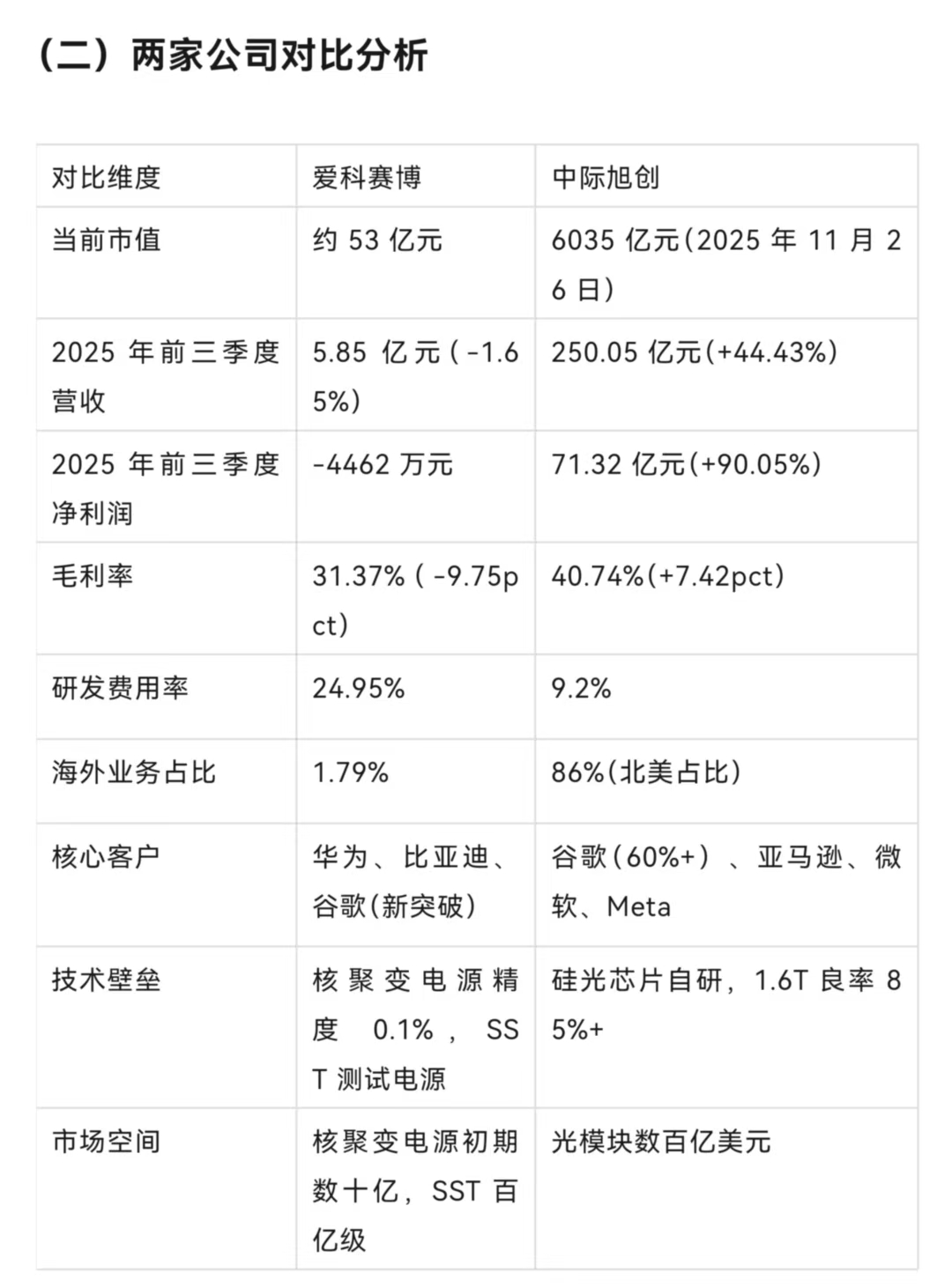 2.差异性:中际旭创处于高速成长期,已实现规模化盈利;爱科赛博仍处于市场开拓期,核聚变业务占比不足 20%,北美业务刚起步,当前处于投入期但成长空间广阔。