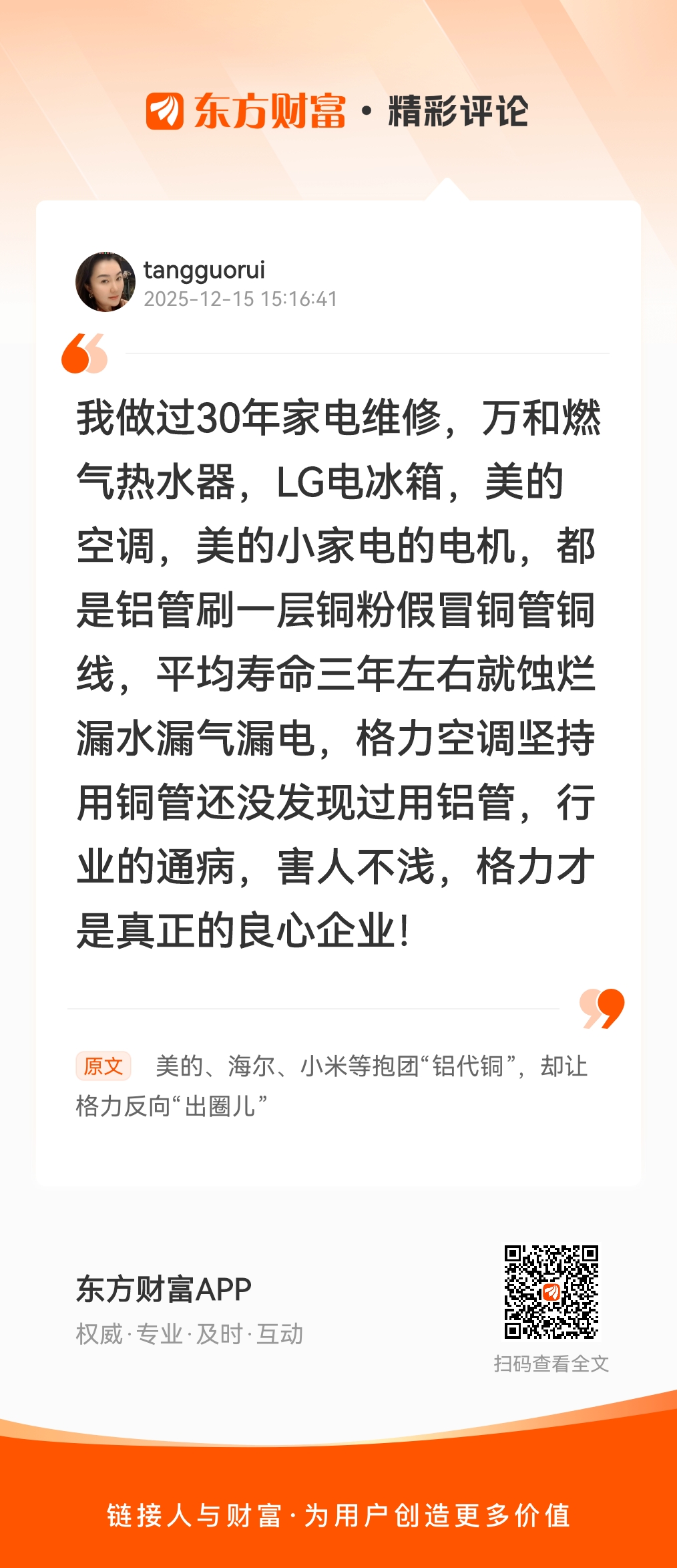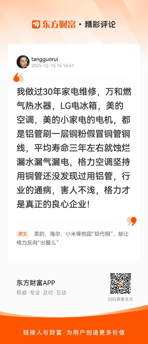 我做过30年家电维修,万和燃气热水器,LG电冰箱,美的空调,美的小家电的电机,都是铝管刷一层铜粉假冒铜管铜线,平均寿命三年左右就蚀烂漏水漏气漏电,格力空调坚持用铜管还没发现过用铝管,行业的通病,害人不浅,格力才是真正的良心企业! 我在《美的、海尔、小米等抱团“铝代铜”,却让格力反向“出圈儿”》的评论获得了大家的关注。