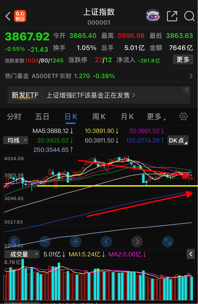 关于大盘,会不会时间换空间?K线向右震荡、缓慢跌幅,120日线向右(随时间),缓慢向上,两者汇于3800点,最终120日线(3800)支撑?(我是不是神棍了啊?!哈哈)