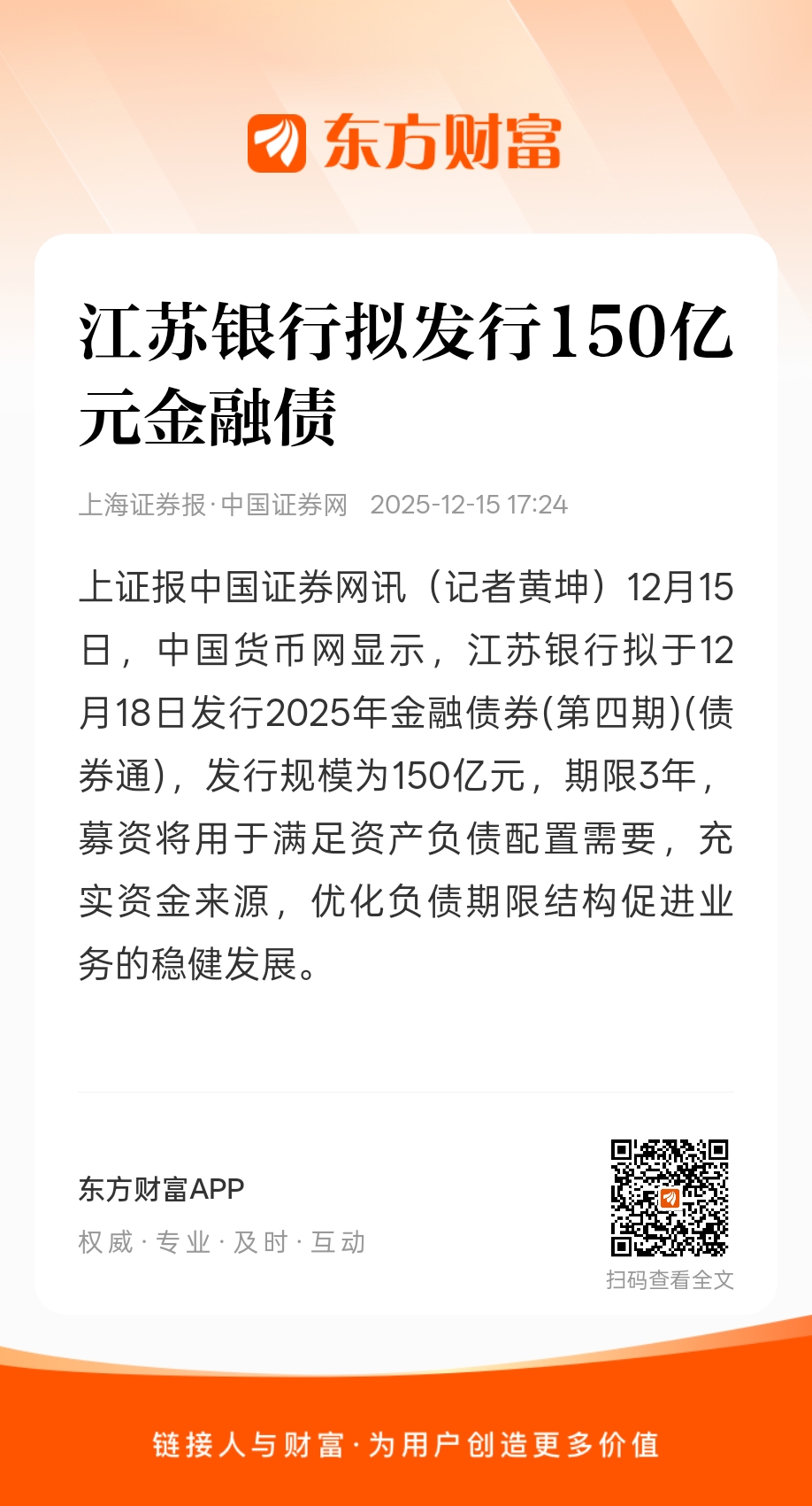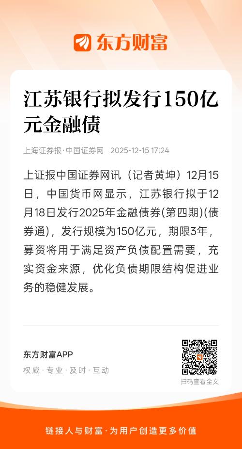 上证报中国证券网讯(记者黄坤)12月15日,中国货币网显示,江苏银行拟于12月18日发行2025年金融债券(第四期)(债券通),发行规模为150亿元,期限3年,募资将用于满足资产负债配置需要,充实资金来源,优化负债期限结构促进业务的稳健发展。