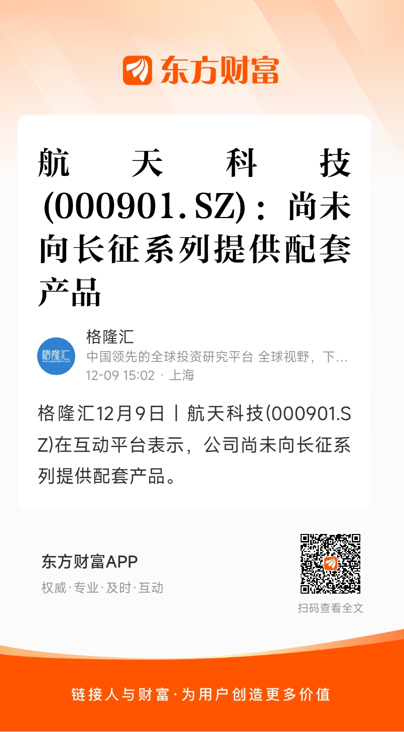 格隆汇12月9日丨航天科技(000901.SZ)在互动平台表示,公司尚未向长征系列提供配套产品。