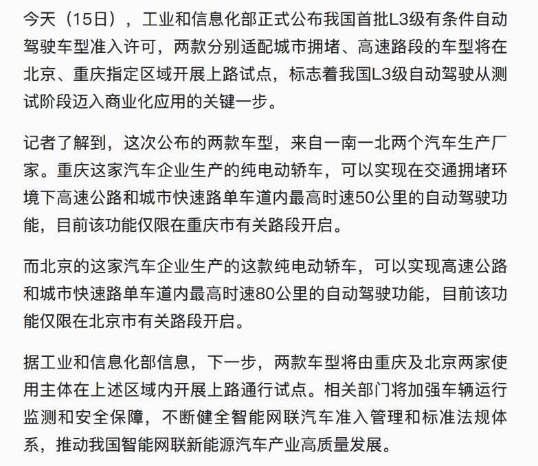 央视:工信部正式公布中国首批L3级有条件自动驾驶车型准入许可,两款分别适配城市拥堵、高速路段的车型将