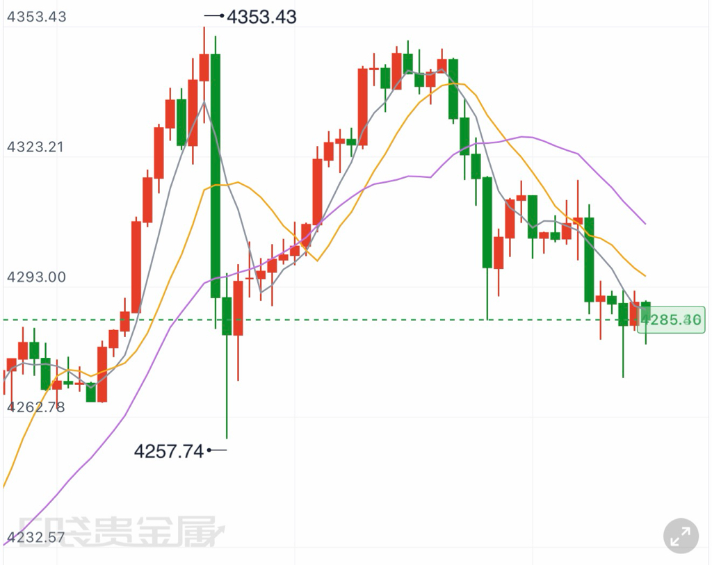 日内继续维持震荡行情,黄金再次触及下方4280支撑一线的位置,都在为晚间大非农数