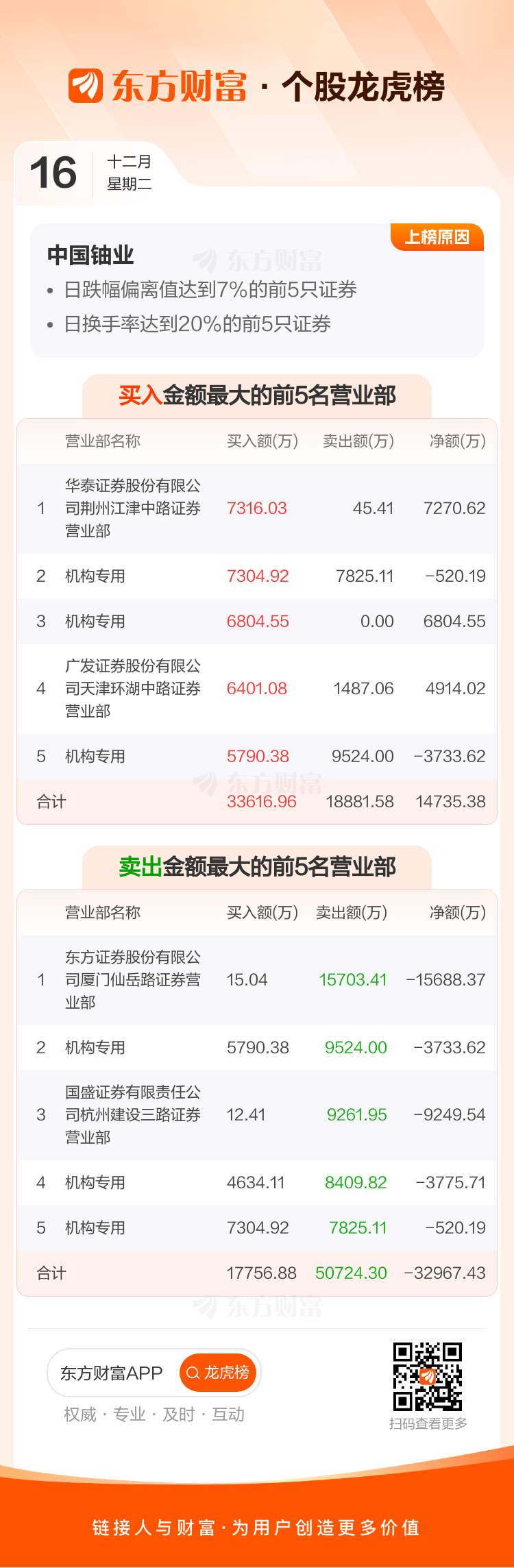 交易所2025年12月16日公布的交易公开信息显示,中国铀业因成为日换手率达到20%的前5只证券、日跌幅偏离值达到7%的前5只证券上榜。中国铀业当日收报67.48元,涨跌幅-10.00%,偏离值43.27%,换手率43.27%,成交额47.36亿。