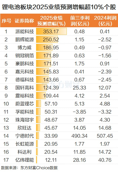 博力威、铜冠铜箔、豪鹏科技、嘉元科技、德福科技、国轩高科、震裕科技2025年全年业绩预测增幅也排名靠前,均超过100%。